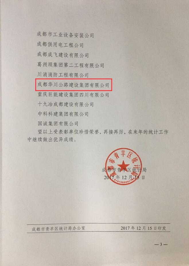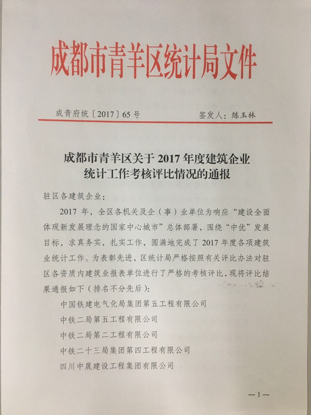 1月24日上午,青羊區(qū)統(tǒng)計局組織召開2017年建設領域統(tǒng)計工作年報會,對全區(qū)36家2017年度統(tǒng)計工作怎么怎么的完成較好的單位建筑企業(yè)進行了通報表彰,集團公司及集團子公司華川集團及華途公司均被評為先進榮獲青羊區(qū)建筑業(yè)統(tǒng)計工作先進單位。