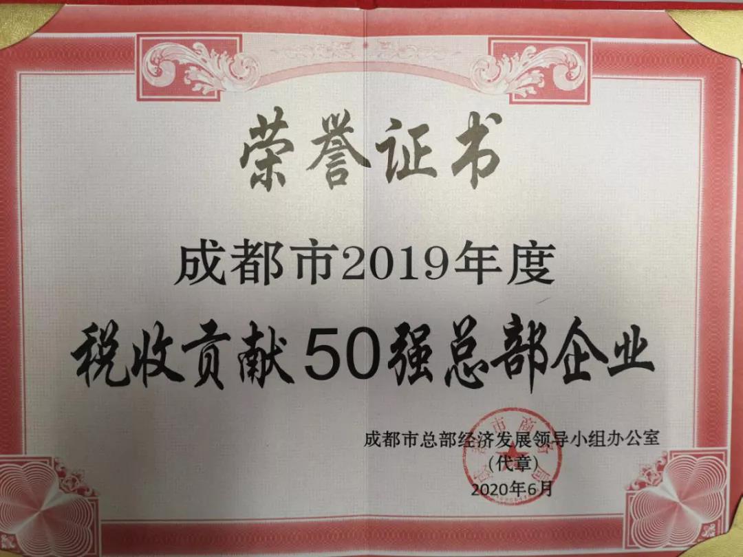 集團(tuán)公司喜獲“成都市2019年度稅收貢獻(xiàn)50強(qiáng)總部企業(yè)”榮譽(yù)稱號(hào)