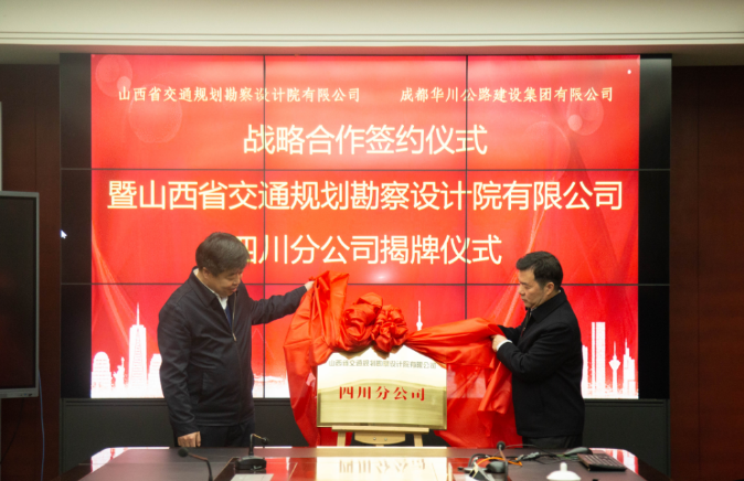 簽約儀式后,舉行山西省交通規(guī)劃勘察設(shè)計(jì)院有限公司四川分公司揭牌儀式,集團(tuán)董事長、總經(jīng)理、黨委書記謝應(yīng)文受邀揭牌。