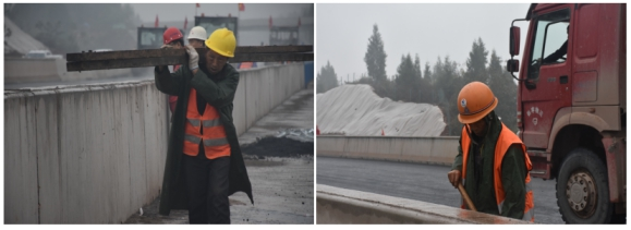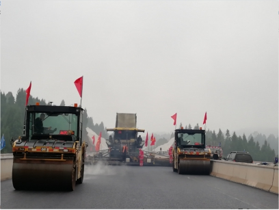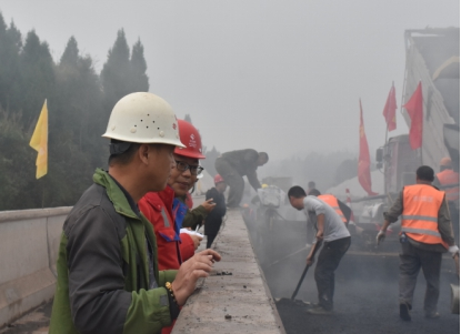 觀施工現(xiàn)場,華川旗幟高高飄揚,迎著微風,伴著小雨,1臺攤鋪機、5臺壓路機、15臺運輸車相互密切配合,攤鋪、碾壓機器發(fā)出的聲響,奏出了一曲鏗鏘有力的“施工進行曲”?,F(xiàn)場負責人及時查看攤鋪厚度,確保厚度在合理范圍內,技術員實時查看瀝青攤鋪溫度,項目部領導駐現(xiàn)場指導,經(jīng)過各級人員的共同努力,精心組織、標準化,文明化施工,攜手完成了本次試驗段鋪筑工作。